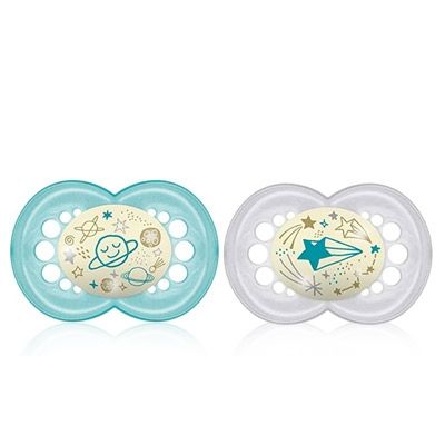 Chupete Nocturno, su escudo brilla en la oscuridad de manera que tanto el padre, la madre o el bebé podrá encontrar el chupete fácilmente.