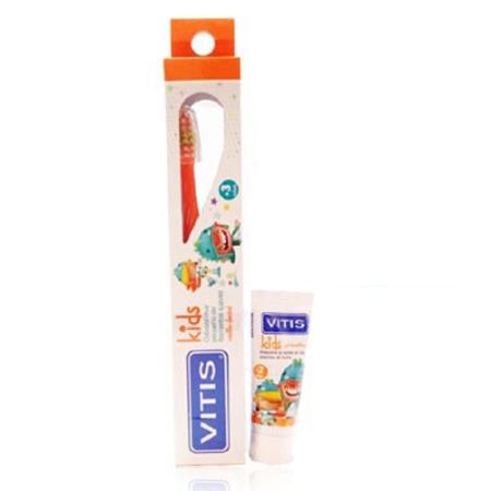 Vitis Kids Cepillo Dental con Cabezal muy pequeño de filamentos suaves. Ahora con un Vitis Kids Gel Dentifrico Fluor Sabor Cereza 8ml