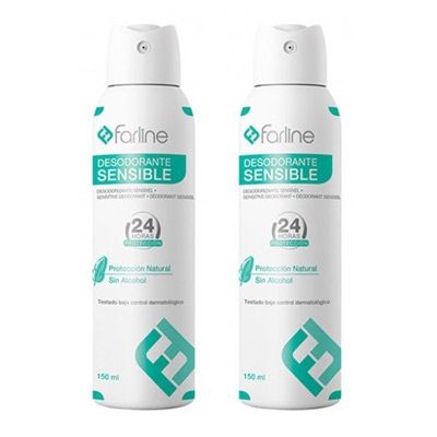 Farline Desodorante Spray Sensible no contiene sales de aluminio y aporta hasta 24 horas de protección. Apto para pieles sensibles.
