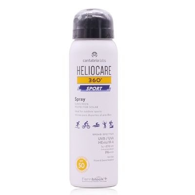 Heliocare 360º Sport Spray proporciona una alta fotoprotección de textura ligera con efecto refrescante. Se extiende con facilidad. Se puede aplicar sobre piel mojada y es resistente al agua y al sudor. Se absorbe rápidamente por lo que también es idóneo para deportes de raqueta o escalada.