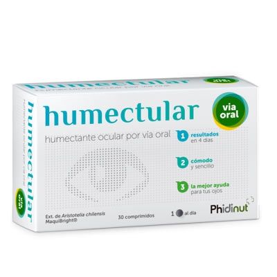 Humectular Phidinut comprimidos es un complemento alimenticio a base de extracto de maqui (Aristotelia chilensis) y zinc para hidratar el ojo y hacer desaparecer la sequedad ocular.