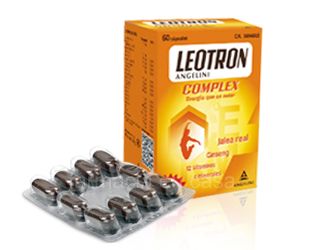 Leotron Complex de Angelini es un complemento alimenticio con Jalea Real, Ginseng, 12 Vitaminas y 4 Minerales, que disminuyen el cansancio, la fatiga, ayudan al rendimiento intelectual normal etc...