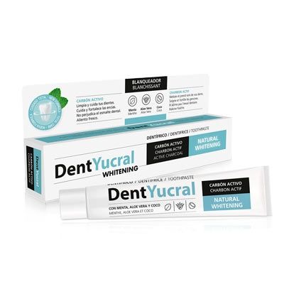 Dentyucral Carbón Activo está indicado para todas las personas que quieren recuperar la blancura y el brillo natural de sus dientes de una forma rápida, simple y segura, sin perjudicar el esmalte dental. También formulado con aceite de coco y Aloe vera para asegurar una higiene eficaz y el cuidado específico de las encías.