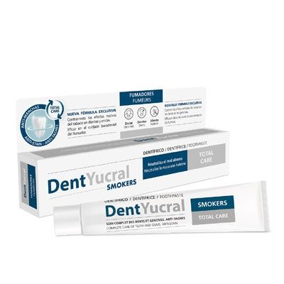 Es importante que el fumador atienda especialmente su higiene y protección bucal, tanto a nivel profesional (realizando periódicamente una revisión con su dentista) como a nivel personal, extremando su limpieza bucal (cepillado, seda dental etc.). DentYucral fumadores ha sido formulado para ayudar a realizar una completa higiene bucal diaria, gracias a las propiedades de sus componentes, especialmente seleccionados para atender las necesidades de limpieza y protección bucal del fumador. Limpieza y cuidado de las piezas dentales. Fortalecimiento y cuidado de las encías. Ayuda a la prevención del aliento de fumador.