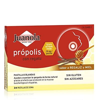 Juanola própolis con regaliz son unas pastillas blandas que combinan el efecto del extracto de própolis (48 mg/pastilla) y el extracto de regaliz o Glycyrrihiza glabra (46 mg/pastilla) para suavizar la garganta gracias al efecto que producen las pastillas en la mucosa bucofaríngea al chuparlas.