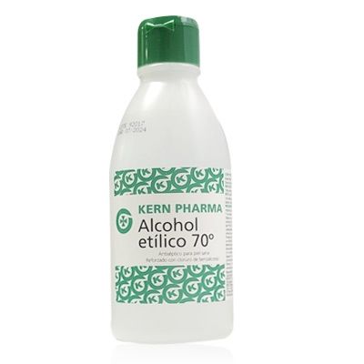 El Acohol Etilico 70º de Kern Pharma es un antiséptico para piel sana, bactericida, virucida y no es eficaz frente a esporas.