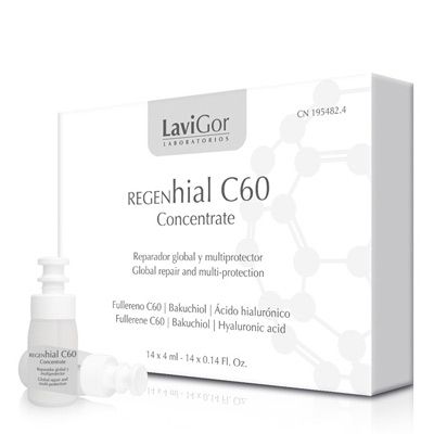 Regenhial C60 Concentrate es un innovador concentrado facial antiedad, de última generación, que aporta un destacado efecto reparador global y multiprotector basado, muy especialmente, en su alta capacidad antioxidante contra las especies reactivas de oxígeno (ROS) con alta capacidad de deterioro y envejecimiento cutáneo.
