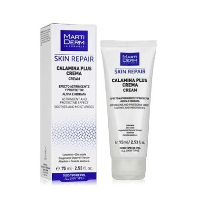 La Crema Calamina Plus de Martiderm alivia la piel y activa su regeneración. Crema a base de Calamina y Óxido de zinc, con efecto astringente y protector, enriquecida con Triéster de Glicerol Oxigenado (TGO), Alantoína y extracto de Centella asiática.