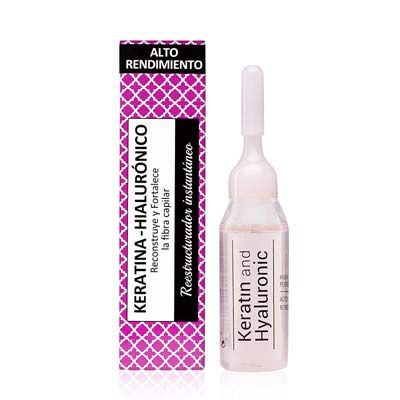 Keratina-Hialurónico Ampolla - Formula especial a base de Keratina y Ácido Hialurónuico que repara el cabello del desgaste diario, a la vez que lo reconstruye de raíz a puntas de manera instantánea, sellando e hidratando la fibra capilar.