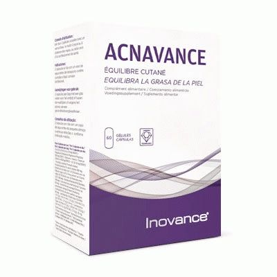 Acnavance 60 Cápsulas es un complemento alimenticio a base de extractos de plantas, zinc, selenio, vitamina B5 y bacterias lácticas.