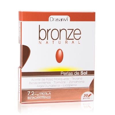 Drasanvi Bronze Natural es un complemento alimenticio a base de aceite de Rosa de Mosqueta, rica en ácidos grasos esenciales, extracto seco de Tomate, Zanahoria y Alga Dunaliella, extractos ricos en pigmentos como el Licopeno, Betacarotenos y Luteína.Además, incorpora una fuente de Vitaminas (A, E, C y B2), destacando la Vitamina E, que contribuye a la protección de las células frente al daño oxidativo. Por su importancia, es necesario mencionar la presencia del aminoácido L-tirosina, precursor de la Melanina (pigmento responsable del color de la piel).