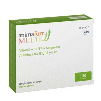 Animafort Multi es un complemento alimenticio en cápsulas vegetales que contiene extracto seco de azafrán, extracto seco de Grifonia (5-HTP), maf¡gnesio, niacina, ácido pantoténico, vitamina B6 y vitamina B12.