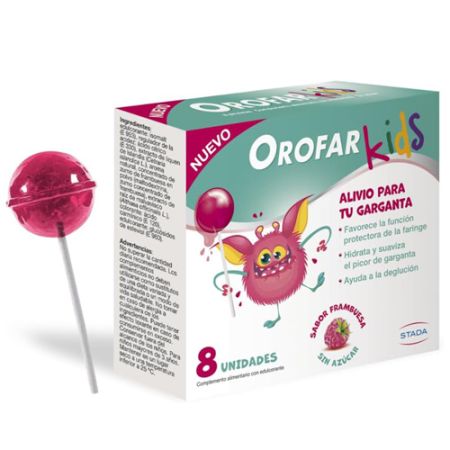 Orofar Kids Alivio para tu Garganta 8 piruletas sabor frambuesa con liquen y malvavisco reconforta la garganta, facilita la deglución y suaviza las mucosas con efecto calmante.