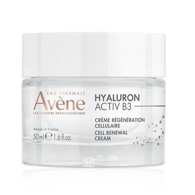 Con la edad todo se acelera. Las células envejecidas se extienden y la piel funciona a cámara lenta. Los laboratorios dermatológicos Avène han creado la crema Hyaluron Activ B3, concentrada al 0,2% en ácido hialurónico puro (de alto y bajo peso molecular) y niacinamida (6 %) para actuar sobre la causa del envejecimiento y prolongar la vida de las células*. La piel queda rellena, alisada y radiante desde la primera aplicación. Después de 2 semanas, se regenera, se reafirma y se reducen las arrugas**. Su textura aterciopelada y delicadamente perfumada proporciona comodidad a la piel. También es una muy buena prebase de maquillaje. La crema regeneradora celular Hyaluron Activ B3 es un producto de cuidado de la piel ecoconcebido que contiene un 92 % de ingredientes de origen natural y se presenta en un tarro de cristal 100 % recargable.