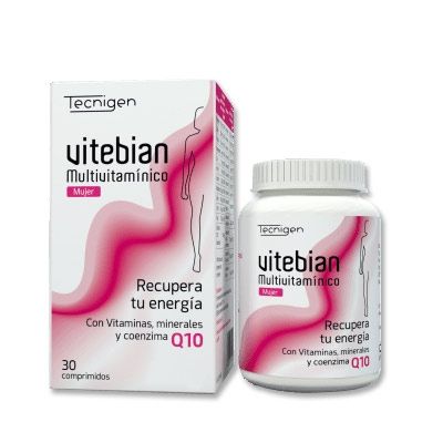 Tecnigen Vitebian Multivitamínico Q10 Mujer es un complemento alimenticio que contiene una combinación de 13 vitaminas, 11 minerales y coenzima Q10, que contribuye a combatir el cansancio y la fatiga.